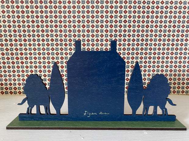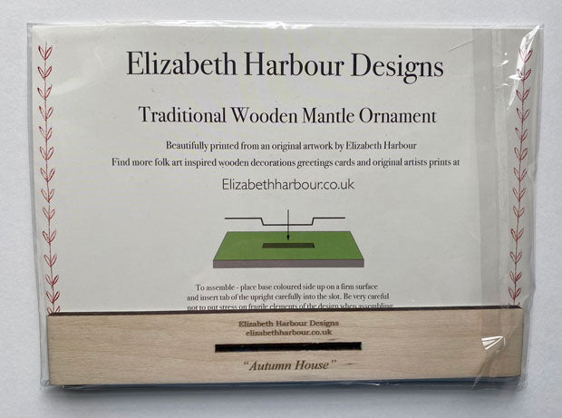 Autumn House' a traditional wooden mantle ornament by Elizabeth Harbour. The design is laser cut from sustainably sourced birch plywood and printed with UV cured inks . It is beautifully printed on the front from an original artwork by Elizabeth Harbour, and in one colour on the back so it can be viewed in silhouette. The ornament is simple self-assembly so that it can be posted easily, a lovely decoration for the home.