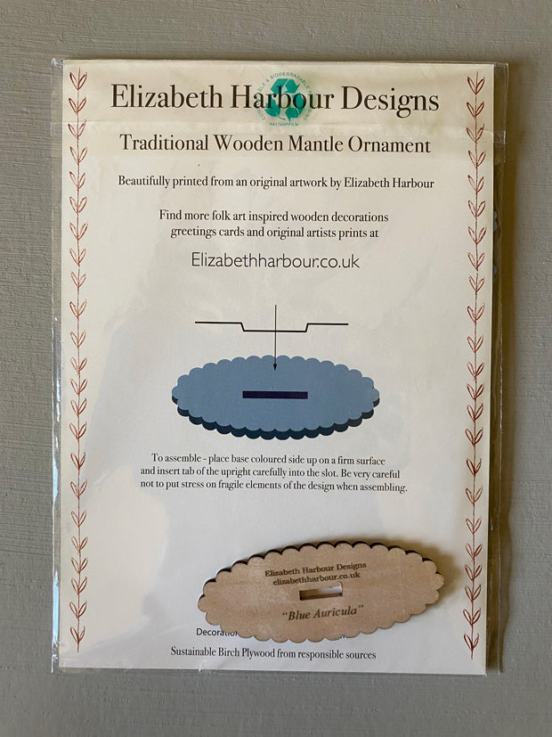 Blue Auricula' a traditional wooden mantle ornament by Elizabeth Harbour. The design is laser cut from sustainably sourced birch plywood and printed with UV cured inks on both sides (so it can face either way). From an original artwork by Elizabeth Harbour. The ornament is simple self-assembly so that it can be posted easily, a lovely decoration for the home.