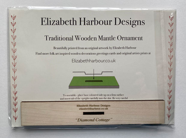 Diamond Cottage' a traditional wooden mantle ornament by Elizabeth Harbour. The design is laser cut from sustainably sourced birch plywood and printed with UV cured inks . It is beautifully printed on the front from an original artwork by Elizabeth Harbour, and in one colour on the back so it can be viewed in silhouette. The ornament is simple self-assembly so that it can be posted easily, a lovely decoration for the home.