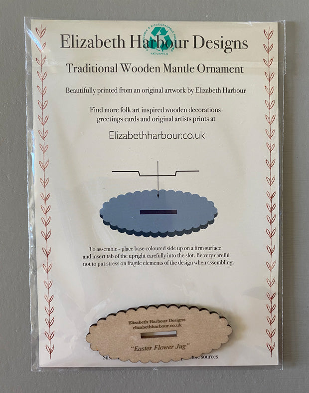 Easter Flower Jug' a traditional wooden mantle ornament by Elizabeth Harbour. The design is laser cut from sustainably sourced birch plywood and printed with UV cured inks on both sides (so it can face either way). From an original artwork by Elizabeth Harbour. The ornament is simple self-assembly so that it can be posted easily, a lovely decoration for the home.