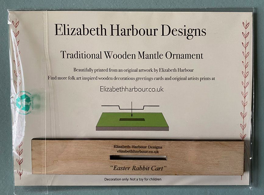 Easter Rabbit Cart' a traditional wooden mantle ornament by Elizabeth Harbour. The design is laser cut from sustainably sourced birch plywood and printed with UV cured inks . It is beautifully printed on the front from an original artwork by Elizabeth Harbour, and in one colour on the back so it can be viewed in silhouette. The ornament is simple self-assembly so that it can be posted easily, a lovely decoration for the home.