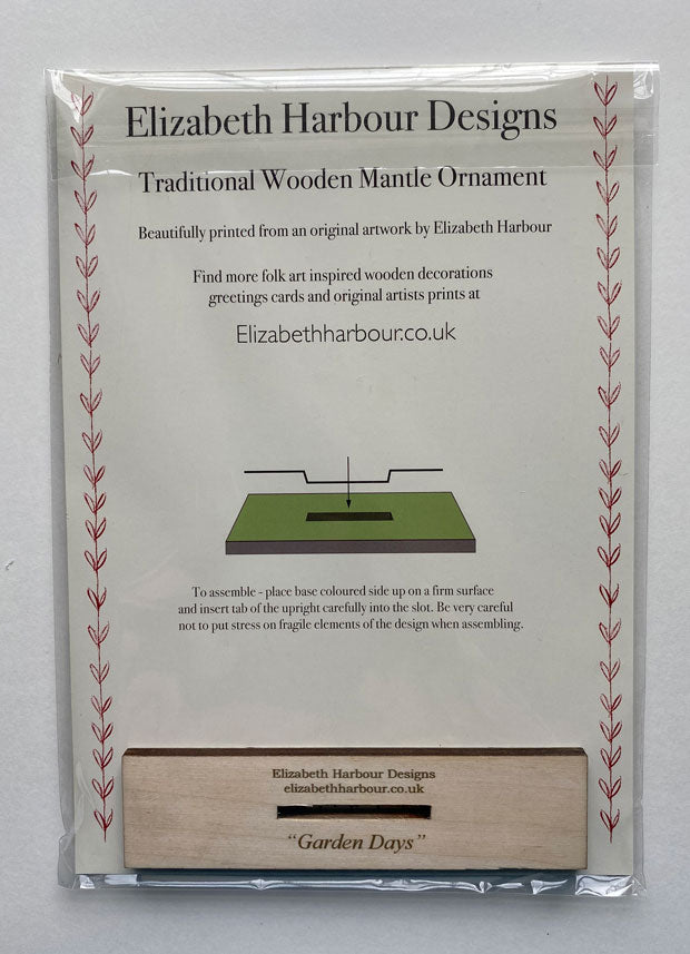 Garden Days' a traditional wooden mantle ornament by Elizabeth Harbour. The design is laser cut from sustainably sourced birch plywood and printed with UV cured inks . It is beautifully printed on the front from an original artwork by Elizabeth Harbour, and in one colour on the back so it can be viewed in silhouette. The ornament is simple self-assembly so that it can be posted easily, a lovely decoration for the home.