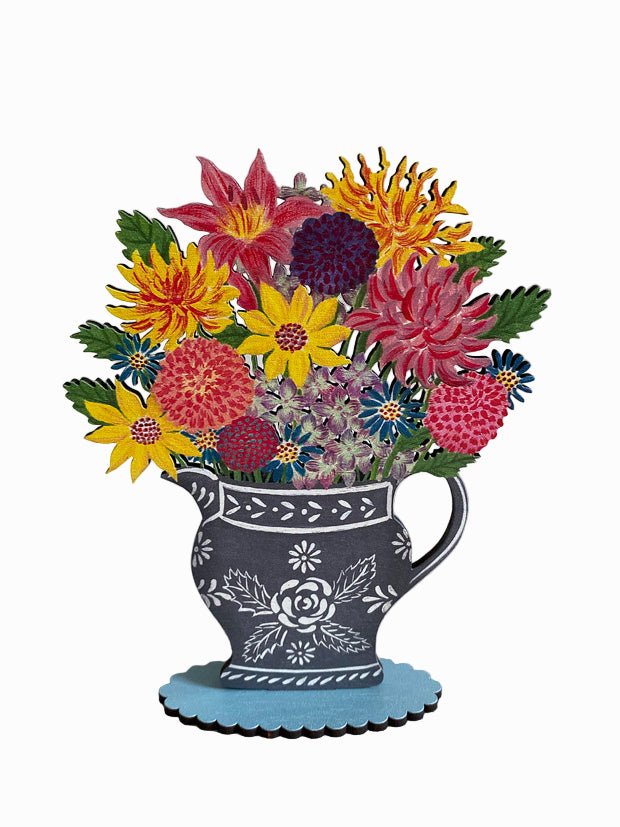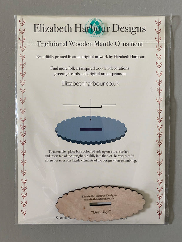 Grey Jug' a traditional wooden mantle ornament by Elizabeth Harbour. The design is laser cut from sustainably sourced birch plywood and printed with UV cured inks on both sides (so it can face either way). From an original artwork by Elizabeth Harbour. The ornament is simple self-assembly so that it can be posted easily, a lovely decoration for the home.