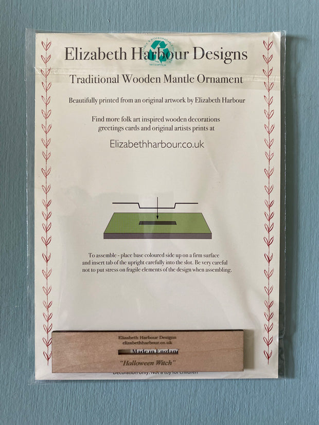 Halloween Witch' a traditional wooden mantle ornament by Elizabeth Harbour. The design is laser cut from sustainably sourced birch plywood and printed with UV cured inks on both sides (so it can face either way). From an original artwork by Elizabeth Harbour. The ornament is simple self-assembly so that it can be posted easily, a lovely decoration for the home.