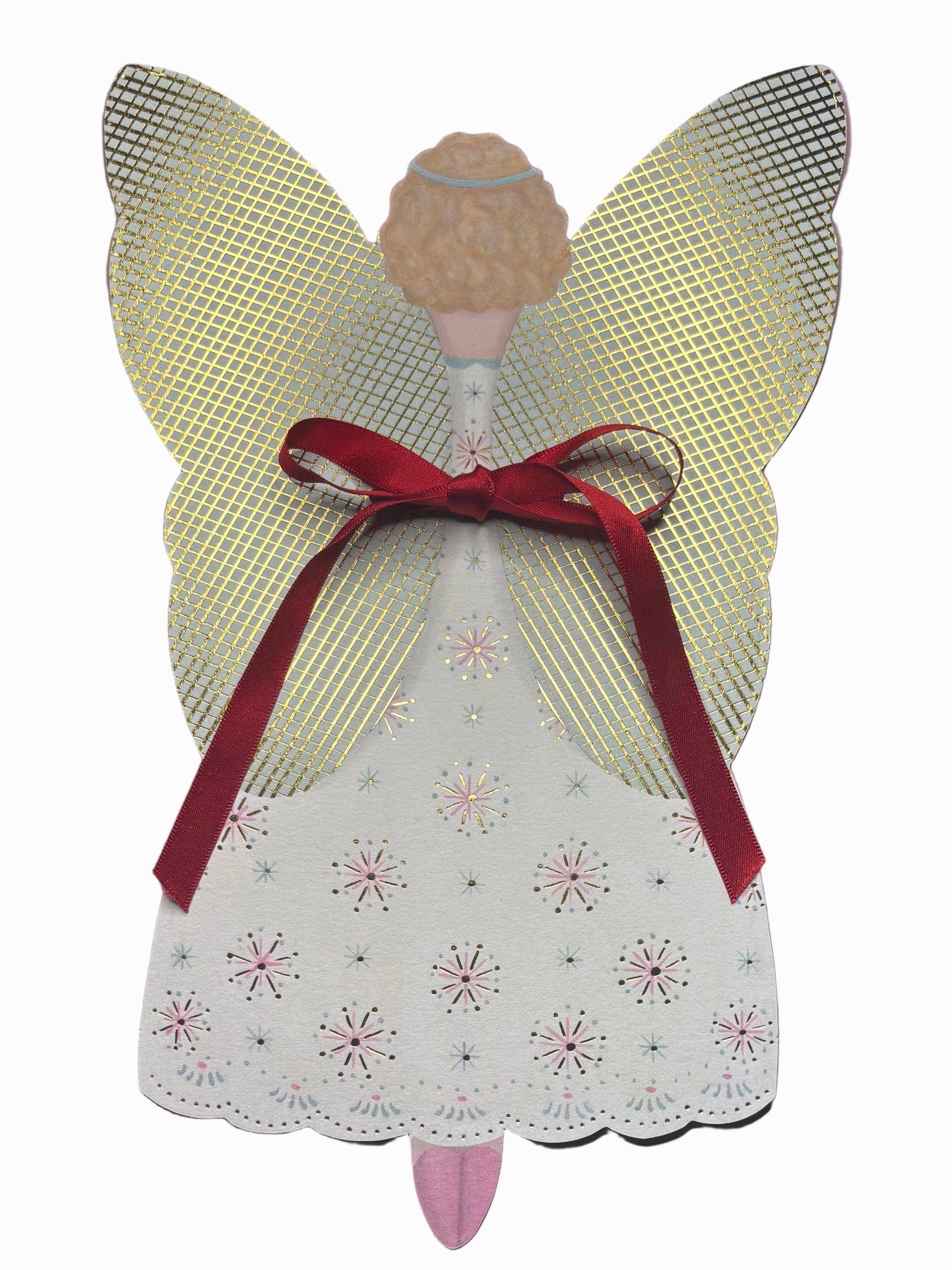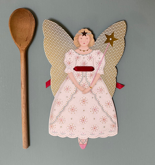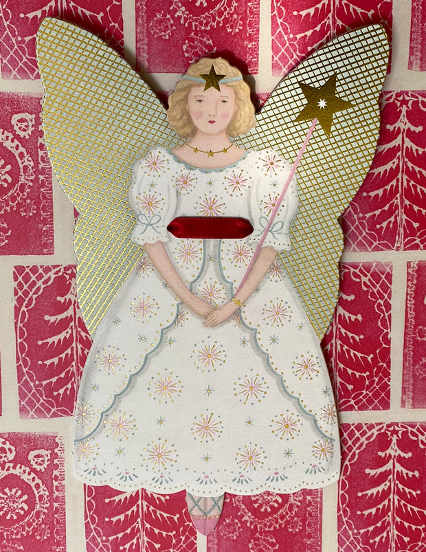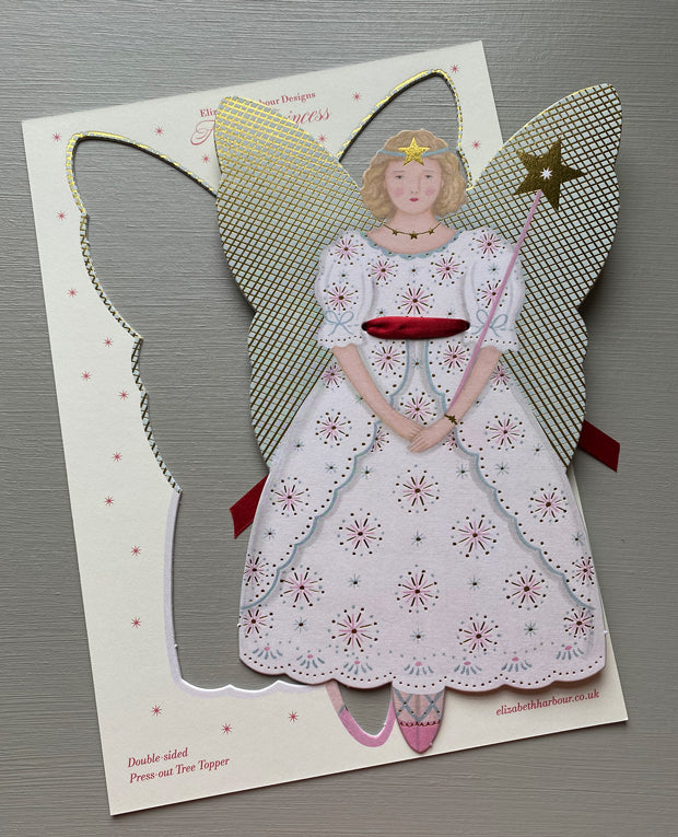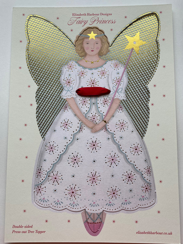 Large, printed, gold foiled, die-cut card, press-out Fairy Princess tree topper by Elizabeth Harbour. Perfect for decorating a Christmas tree or displaying as a wall hanging.