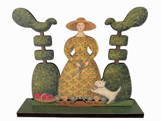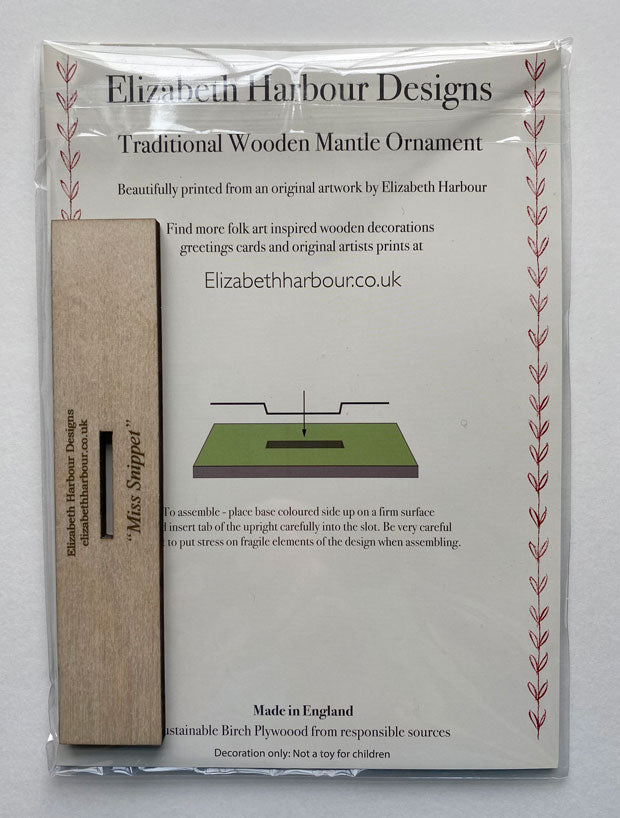Miss Snippet' a traditional wooden mantle ornament by Elizabeth Harbour. The design is laser cut from sustainably sourced birch plywood and printed with UV cured inks . It is beautifully printed on the front from an original artwork by Elizabeth Harbour, and in one colour on the back so it can be viewed in silhouette. The ornament is simple self-assembly so that it can be posted easily, a lovely decoration for the home.