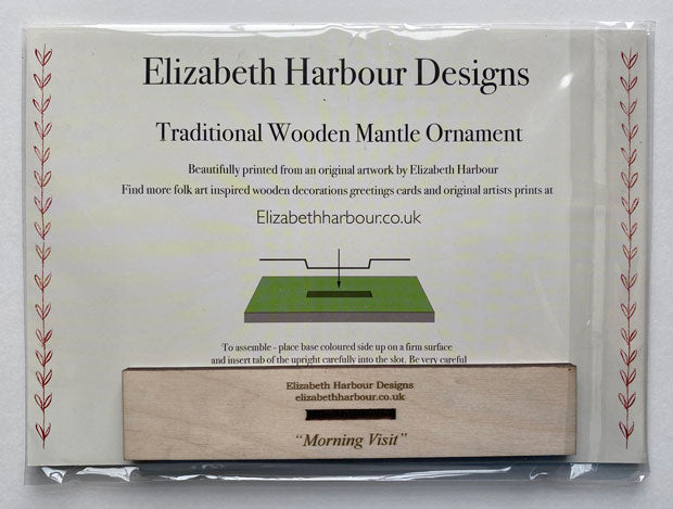 Morning Visit' a traditional wooden mantle ornament by Elizabeth Harbour. The design is laser cut from sustainably sourced birch plywood and printed with UV cured inks . It is beautifully printed on the front from an original artwork by Elizabeth Harbour, and in one colour on the back so it can be viewed in silhouette. The ornament is simple self-assembly so that it can be posted easily, a lovely decoration for the home.