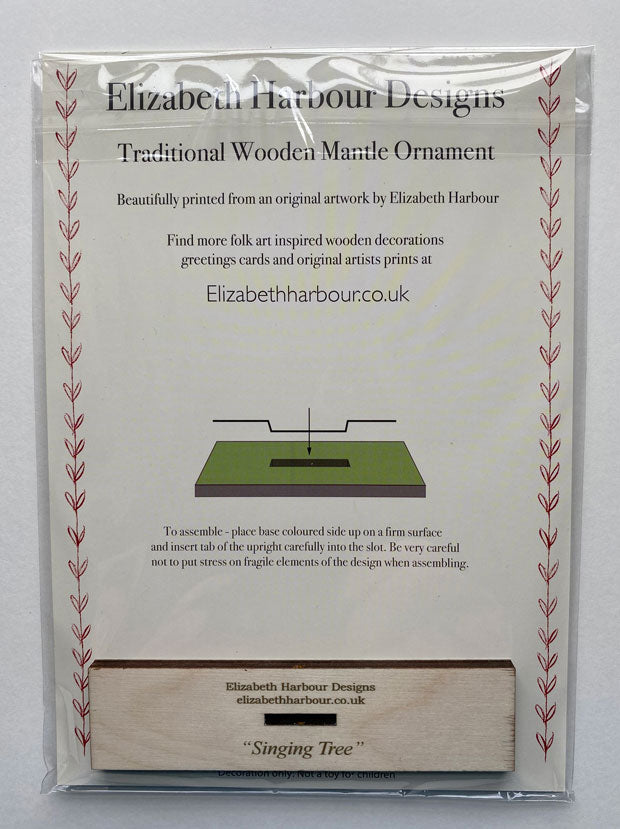 Singing Tree'na traditional wooden mantle ornament by Elizabeth Harbour. The design is laser cut from sustainably sourced birch plywood and printed with UV cured inks . It is beautifully printed on the front from an original artwork by Elizabeth Harbour, and in one colour on the back so it can be viewed in silhouette. The ornament is simple self-assembly so that it can be posted easily, a lovely decoration for the home.