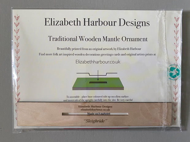 Sleighride' a traditional wooden mantle ornament by Elizabeth Harbour. The design is laser cut from sustainably sourced birch plywood and printed with UV cured inks . It is beautifully printed on the front from an original artwork by Elizabeth Harbour, and in one colour on the back so it can be viewed in silhouette. The ornament is simple self-assembly so that it can be posted easily, a lovely decoration for the home.