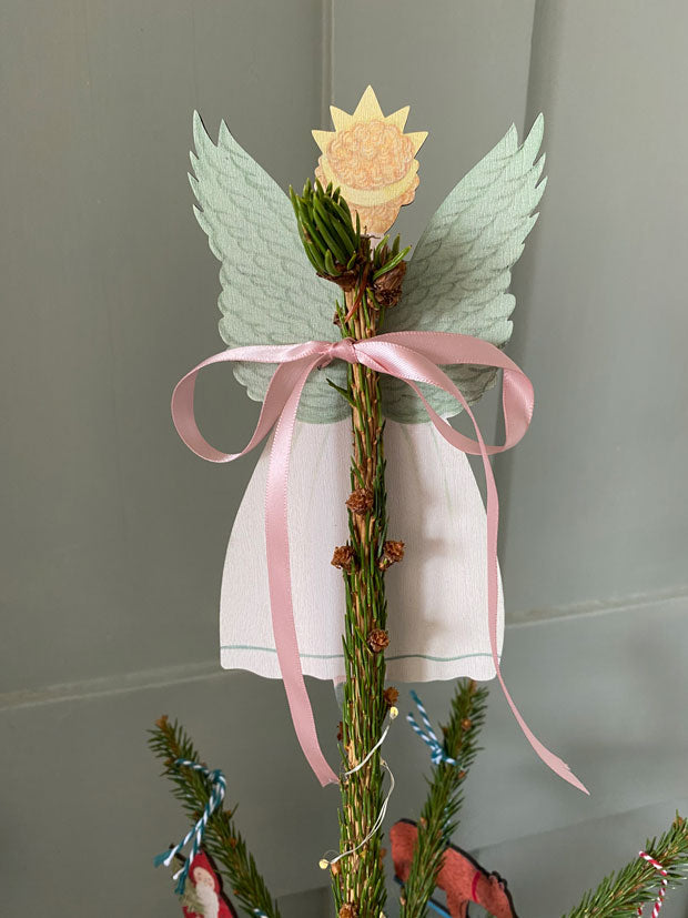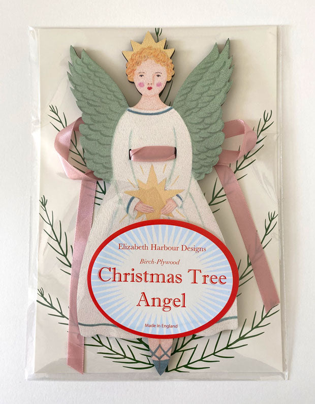 A Traditional wooden decoration by Elizabeth Harbour. Satin ribbon included for you to tie your decoration to the top of the Christmas tree. The design is laser cut from sustainably sourced birch plywood and printed with UV cured inks on both sides . From an original artwork by Elizabeth Harbour